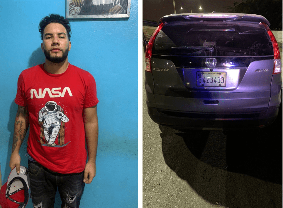 El detenido por una patrulla de la uniformada fue identificado como Gerónimo Edwardo Sánchez, de 27 años, quien se desplazaba por la Avenida Joaquín Balaguer, a bordo de la Jeepeta marca Honda, modelo CRV, color gris, año 2013, placa No. G423433, chasis No. 2HKRM4H5XDH603906.