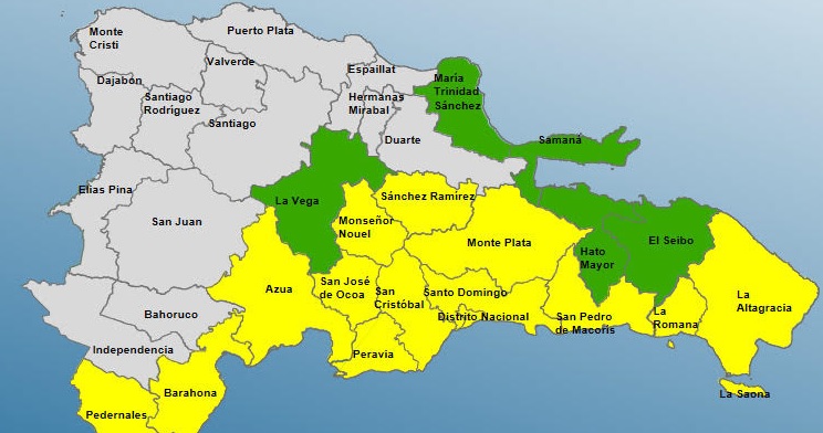 En tanto, permanecen en alerta verde El Seibo, Monseñor Nouel, Sánchez Ramírez, Hato Mayor y San José de Ocoa.